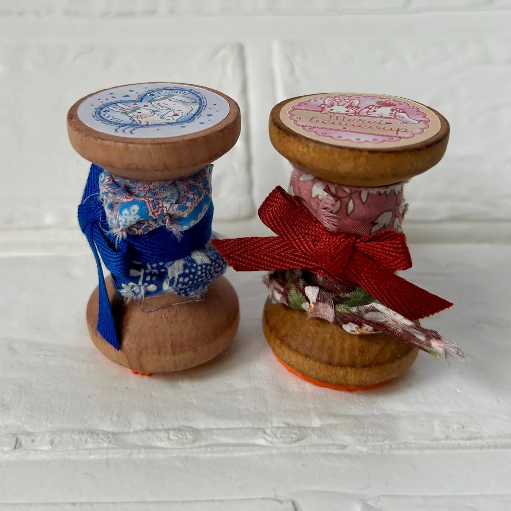 This time, we've coordinated two colors: red and blue. You can also wrap your own fabric, ribbons, or thread around them. Simply wrapping fabric or tape around the spools makes for cute, easy stamps. Be sure to put a sticker on top.